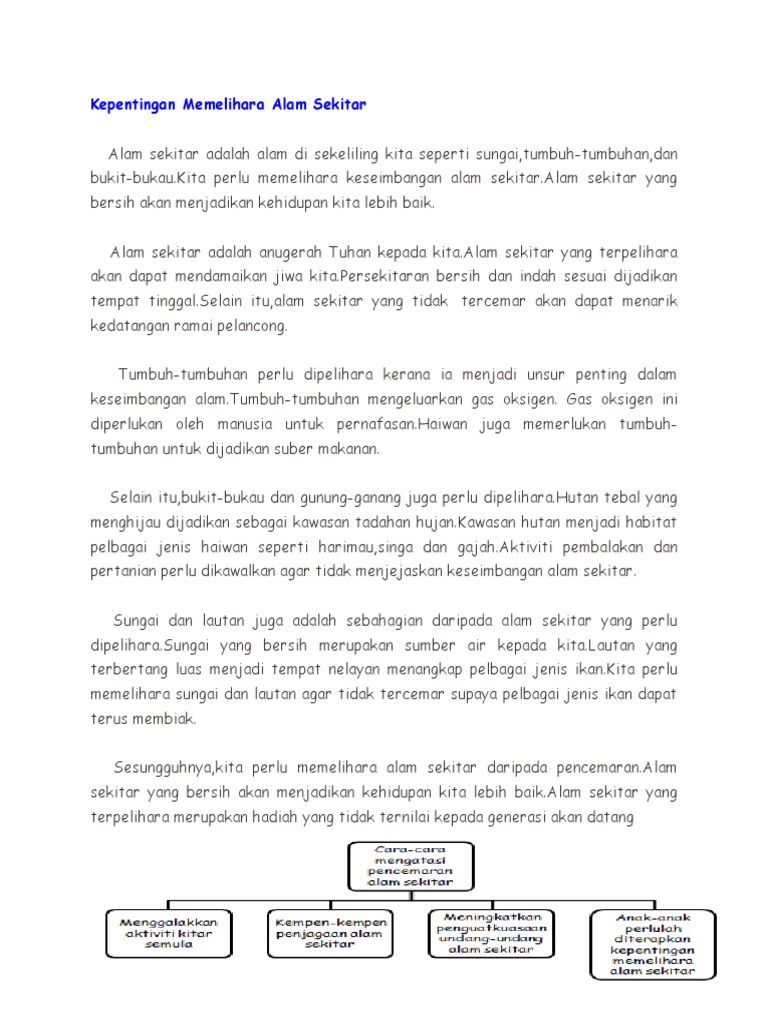 Karangan Kepentingan Menjaga Alam Sekitar Pdf Document from demo.vdocuments.mx Alam sekitar ialah anugerah tuhan kepada kita. Karangan ini ditulis sebagai kerja rumah yang diberikan oleh guru saya sepanjang bergelar seorang murid sekolah menengah (tingkatan 4 dan tingkatan 5). Kepentingan menjaga silaturahim amat dititikberatkan dalam islam, malah allah menjanjikan ganjaran besar untuk orang yang sentiasa menjaga hubungan itu. Jadi pengajaran alam sekitar adalah pengajaran yang dapat dimaknai sebagai proses mengubah tingkah laku anak didik agar menjadi manusia dewasa bekerja dikebun sekolah untuk menanam, memelihara, memetik tanaman. Maka, setiap diantara kita perlu bermuhasabah dan mula mencari jalan dalam memulihara serta memelihara alam sekitar demi menjamin kepentingan alam. Menanam banyak pokok dapt memberi kesegaran pada persekitaran. Alam sekitar adalah sangat penting kepada manusia kerana alam sekitar membekalkan oksigen alam sekitar yang berkualiti juga amat penting untuk memelihara hubungan antara satu organisma keseimbangan antara pengurusan alam sekitar dengan kepentingan ekonomi dan pembangunan. Download kepentingan memelihara alam sekitar.