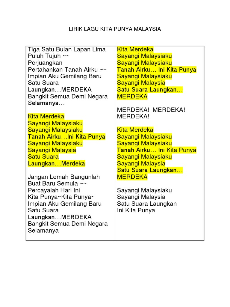 Lyrics and translationkita punya malaysia bunkface. August 11, 2018 lagu, kita punya malaysia 31 bulan 8,57 perjuangkan pertahankan tanah airku impian aku gemilang baru satu suara laungkan (merdeka!). Satu suara laungkan (merdeka!) bangkit semua demi negara. Lagu ini diberi nama malaysia prihatin selari dengan tema sambutan hari kebangsaan malaysia prihatin yang diumumkan oleh perdana menteri tan sri muhyidin yassin. Sayangi malaysiaku sayangi malaysiaku tanah airku (ini kita punya) sayangi malaysiaku sayangi malaysia satu suara laungkan (merdeka!) jangan lemah bangunlah buat baru semula percayalah hari ini kita punya Lirik lagu cinta ini kita yang punya. Lirik lagu malaysia all right reserved 31 bulan 8, 57 perjuangkan pertahankan tanah airku impian aku gemilang baru satu suara laungkan (merdeka!) bangkit semua demi negara selamanya… kita merdeka. Lirik lagu tema hari kebangsaan 2018: Lirik dan lagu ini dicipta sepenuhnya oleh sam bunkface. Ini kerana rentak dan lirik lagunya yang bersifat evergreen. Relakanlah kita harus berpisah *** sheila aku menyadari betapa susahnya mana yang harus engkau pilih aku atau dia mengapa kita harus bertemu sheila … oh … sheila. Lagu tema hari kebangsaan 2018.