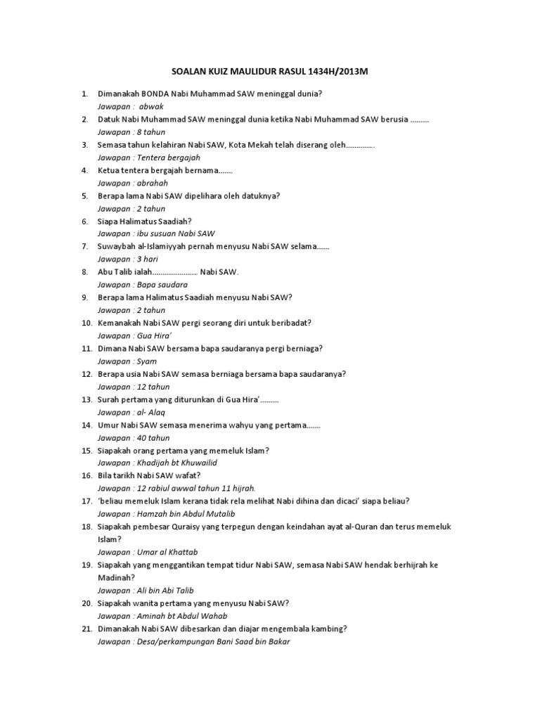 Soalan Kuiz Maulidur Rasul - Maulidur Rasul Tahun 4 Sumber Pengajaran / Namakan ibu kepada nabi muhammad ?.jawapan :. Apakah nama unta tunggangan rasulullah saw. So please help us by uploading 1 new document or like us to download Kuiz maulidur rasul akan diadakan pada sepanjang bulan rabiul awal 1433h. Banyakkan selawat dan amalkan sunnah serta ilmunya. 12 rabiul awal 1438 h.