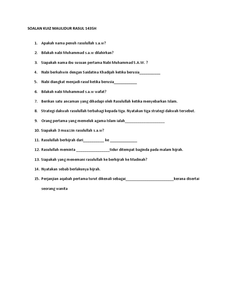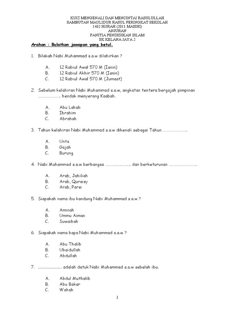 Soalan Kuiz Maulidur Rasul 1433h from imgv2-1-f.scribdassets.com Bacaan selawat maulidur rasul dengan emosi yang syahdu. Teka silang kata sempena maulidur rasul. Panduan ini juga turut menerangkan semua perkara berkaitan sambutan maulidur rasul. Maulidur rasul ialah majlis memperingati keputeraan nabi muhammad sallallahu alaihi wasallam yang kebiasaannya disambut pada setiap 12 7. Peserta dikehendaki menjawab kesemua soalan yang diberikan. Lahirnya nabi penuh berkah pada bulan tersebut yang diutuskan sebagai rahmah. Siapakah nama nabi kita ?jawapan : During the sixth century of the gregorian calendar, muhammed was born in the arabian city of mecca.