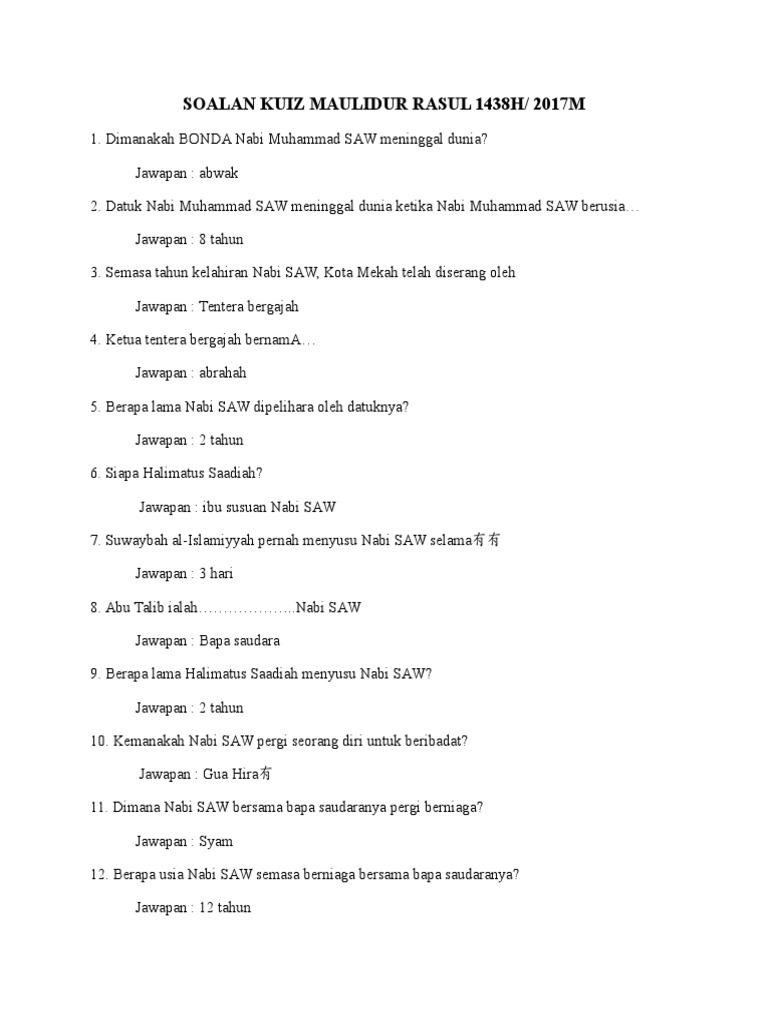 Koleksi Soalan Kuiz Program Motivasi Media Sosial Facebook from lookaside.fbsbx.com See more of salam maulidur rasul on facebook. Kuiz maulidur rasul akan diadakan pada sepanjang bulan rabiul awal 1433h. Soalan dimuat turun lebih awal sehari di laman ini dan ditampal di lebuh maklumat pada hari berikutnya. So please help us by uploading 1 new document or like us to download Please copy and paste this embed script to where you want to embed. Bersempena mengingati dan menyantuni junjungan besar kita nabi muhammad, mari kita mengingati baginda. Bahan ini di ambil dari post berikut : Bertepatan dengan hari senin, itsnain.